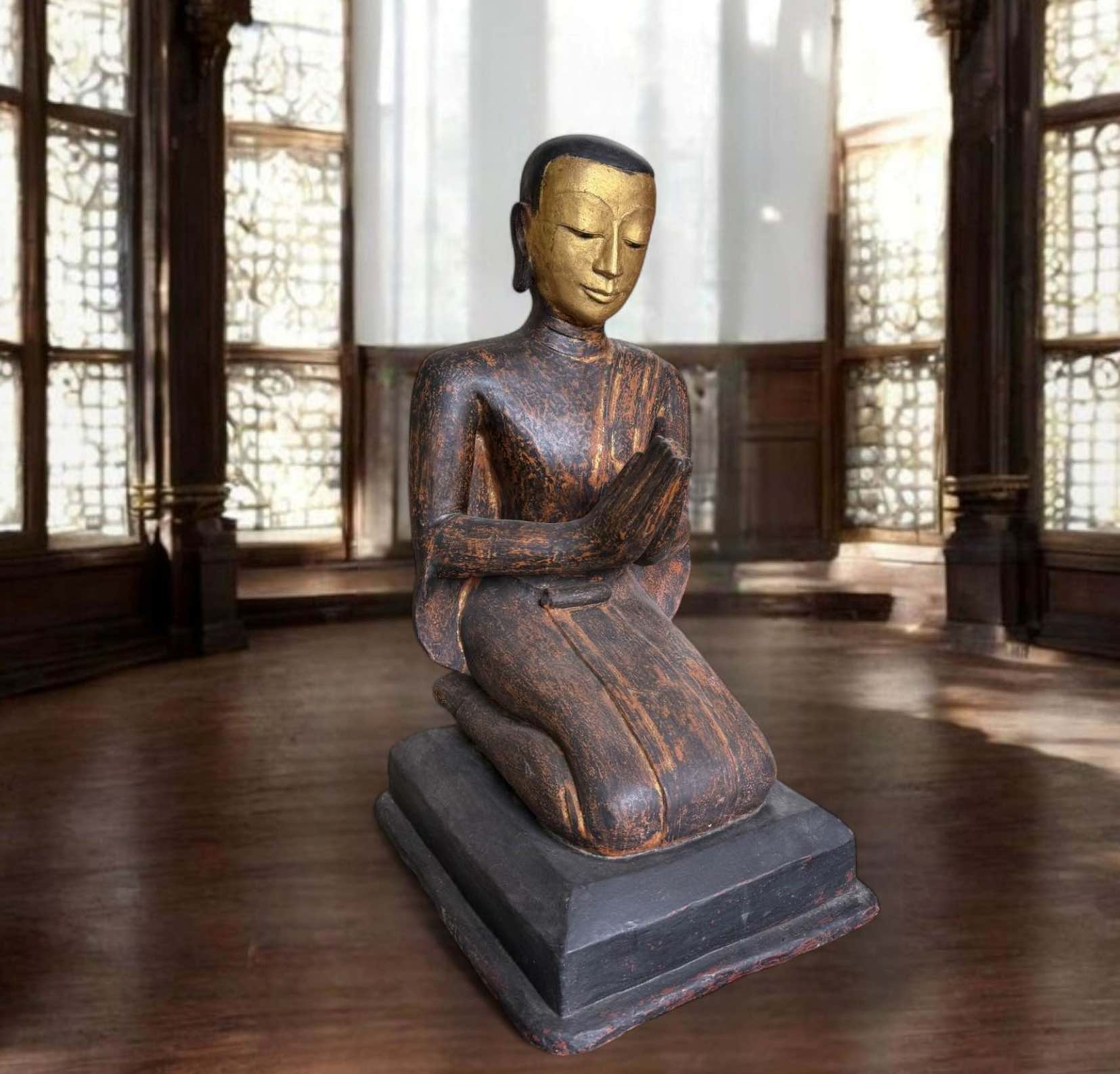 Theppanom Holzfigur Thailand – Blattvergoldeter Schutzengel in Anjali-Mudra Diese seltene Theppanom-Figur aus Thailand verkörpert die Schönheit und Spiritualität traditioneller Tempelkunst. Der kniende Engel in Anjali-Mudra – der Geste des Grußes und der Hingabe – symbolisiert Ehrerbietung gegenüber dem Göttlichen und steht für Schutz, Reinheit und Frieden. Aus Holz gefertigt und teilweise blattvergoldet, besticht die Figur durch feine Handarbeit, reiche Ornamentik und ein authentisches, craqueliertes Finish. Spannungsrisse und leichte Altersspuren betonen die Originalität und das geschätzte Alter von ca. 70–90 Jahren. Herkunft: deutscher Sammlernachlass. Zu dieser Figur gehört ein zweiter, ergänzender Tempelwächter aus demselben Nachlass – traditionell werden Theppanom-Engel als Paar aufgestellt, um Eingänge zu schützen und harmonische Energie zu bewahren. Beide Figuren können einzeln oder als Paar erworben werden. Material: Holz, Blattgold und Farbfassung Maße: ca. 77 × 24 × 28 cm Gewicht: ca. 6,5 kg Alter: ca. 70–90 Jahre Provenienz: Deutscher Sammlernachlass Spirituelle Bedeutung: In der thailändischen Mythologie gelten Theppanom als himmlische Boten, die zwischen Himmel und Erde vermitteln. Sie wachen an Tempelportalen und schützen Orte spiritueller Energie. Ihre Anjali-Geste steht für Demut, Harmonie und Dankbarkeit. Ein herausragendes Sammlerstück – ideal für anspruchsvolle Sammler, asiatisch inspirierte Wohnräume oder spirituelle Orte.