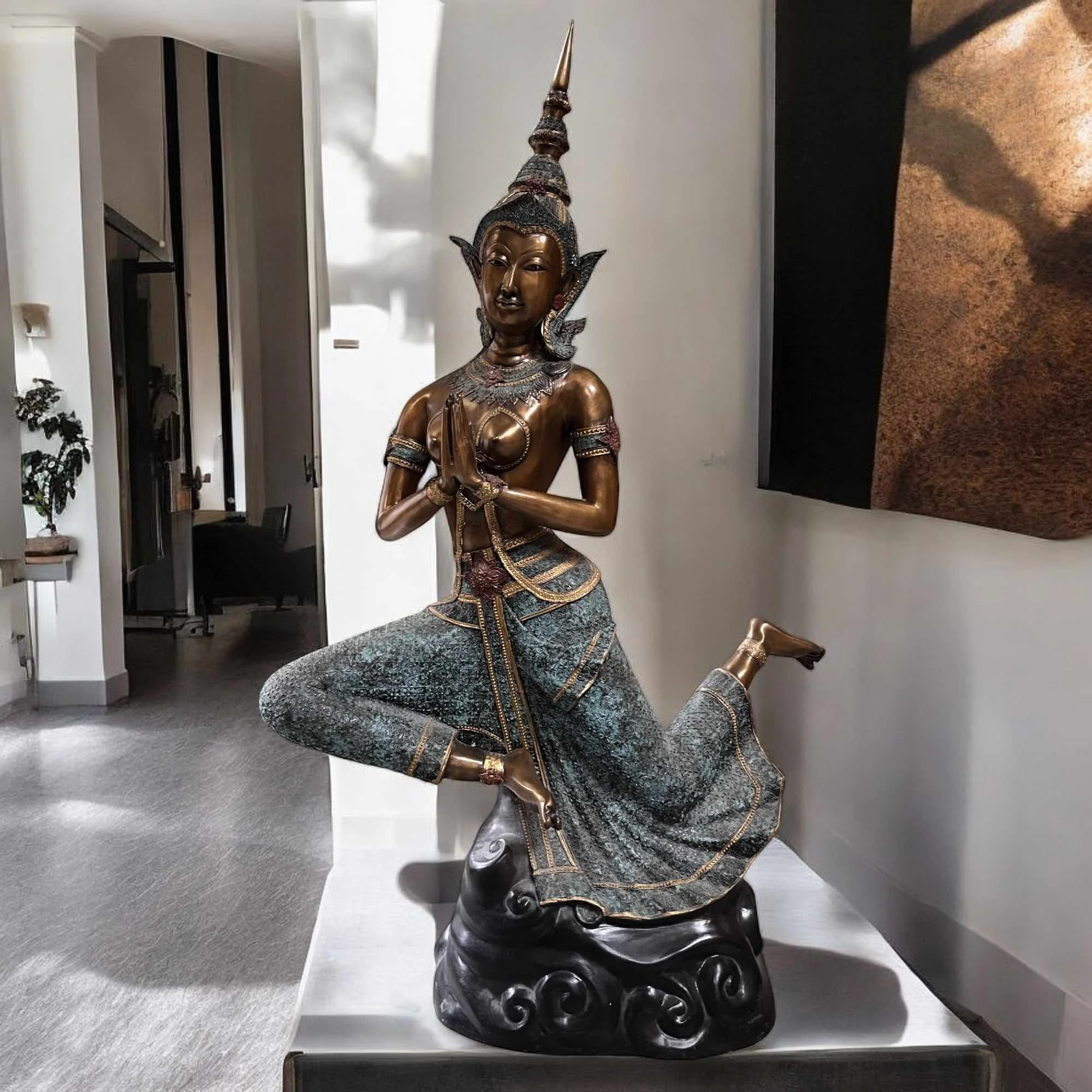 Man findet sie häufig in thailändischen Tempeln, wo sie als stille Wächter der heiligen Orte dienen. Thewada werden oft in anmutigen Posen mit detailreichen Gewändern und Kronen dargestellt, die ihre göttliche Herkunft betonen. Sie symbolisieren die Präsenz des Göttlichen und verleihen Tempeln und spirituellen Orten eine friedvolle, heilige Atmosphäre.