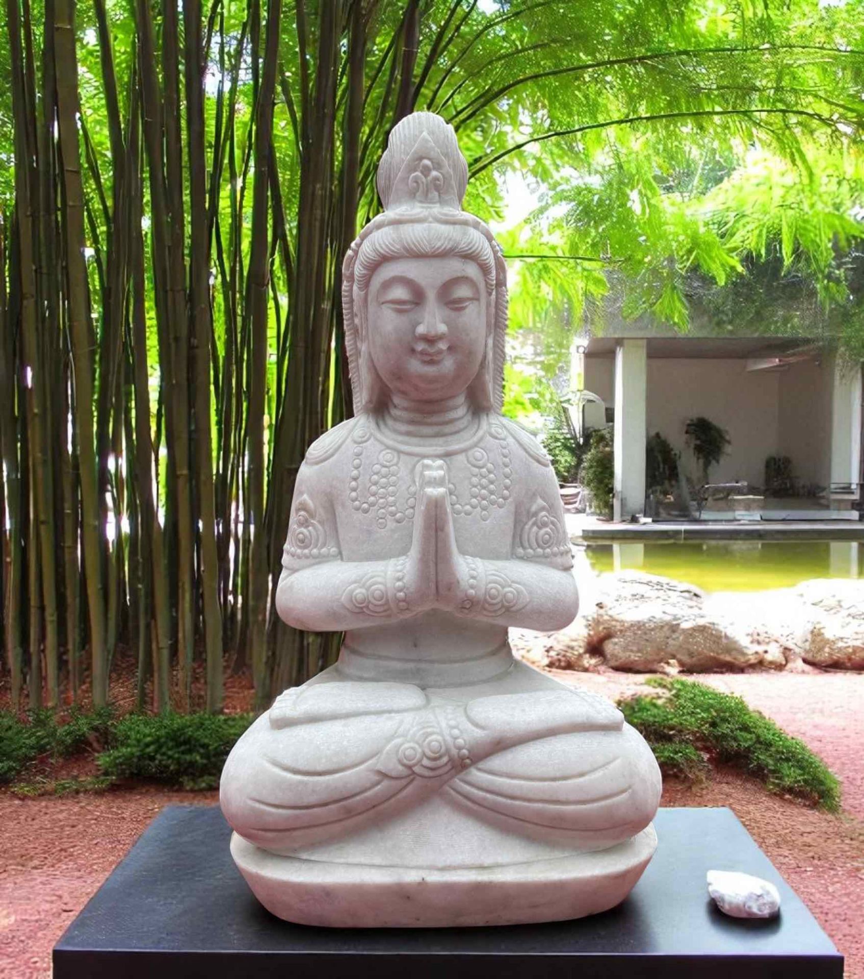 Marmor Buddha Statue 60 cm – Tibet/China – Anjali Mudra – Handgefertigt & Frostsicher Diese edle Buddha-Statue aus Marmor verleiht jedem Garten, Eingangsbereich oder Wohnraum eine friedvolle und harmonische Ausstrahlung. Die Figur zeigt den Buddha in der Anjali-Mudra – der klassischen Geste des Grußes, der Dankbarkeit und des Respekts. Sie symbolisiert die Einheit von Herz und Geist und erinnert an Achtsamkeit und innere Balance. Gefertigt in Tibet/China, besticht diese Statue durch ihre ruhige Formensprache und das klare Weiß des Marmors. Die Buddhafigur wurde in Handarbeit gefertigt und überzeugt durch Langlebigkeit und zeitlose Eleganz. Der massive Naturstein ist witterungsbeständig und frostsicher, sodass die Statue ganzjährig im Außenbereich verbleiben kann. 🪷 Tipp: Ein Buddha sollte nicht direkt auf dem Boden stehen. Verwenden Sie Tuffsteine, alte Klinker oder eine Natursteinplatte, um die Figur leicht erhöht zu platzieren – das wirkt harmonischer und schützt zugleich vor Feuchtigkeit. Produktdetails: Material: Hochwertiger Marmor Herkunft: Tibet/China Maße: ca. 60 × 40 × 25 cm – ca. 55 kg Darstellung: Buddha in Anjali-Mudra (Grußgeste) Farbe: Natürlicher Marmor mit sanftem Glanz Verwendung: Für Innen- & Außenbereiche geeignet, frostsicher Stil: Asiatisch, schlicht, harmonisch Diese Buddha-Statue ist nicht nur ein Symbol für Frieden, Respekt und Achtsamkeit, sondern auch ein stilvolles Gestaltungselement, das Ihrem Zuhause oder Garten eine spirituelle und ästhetische Tiefe verleiht.