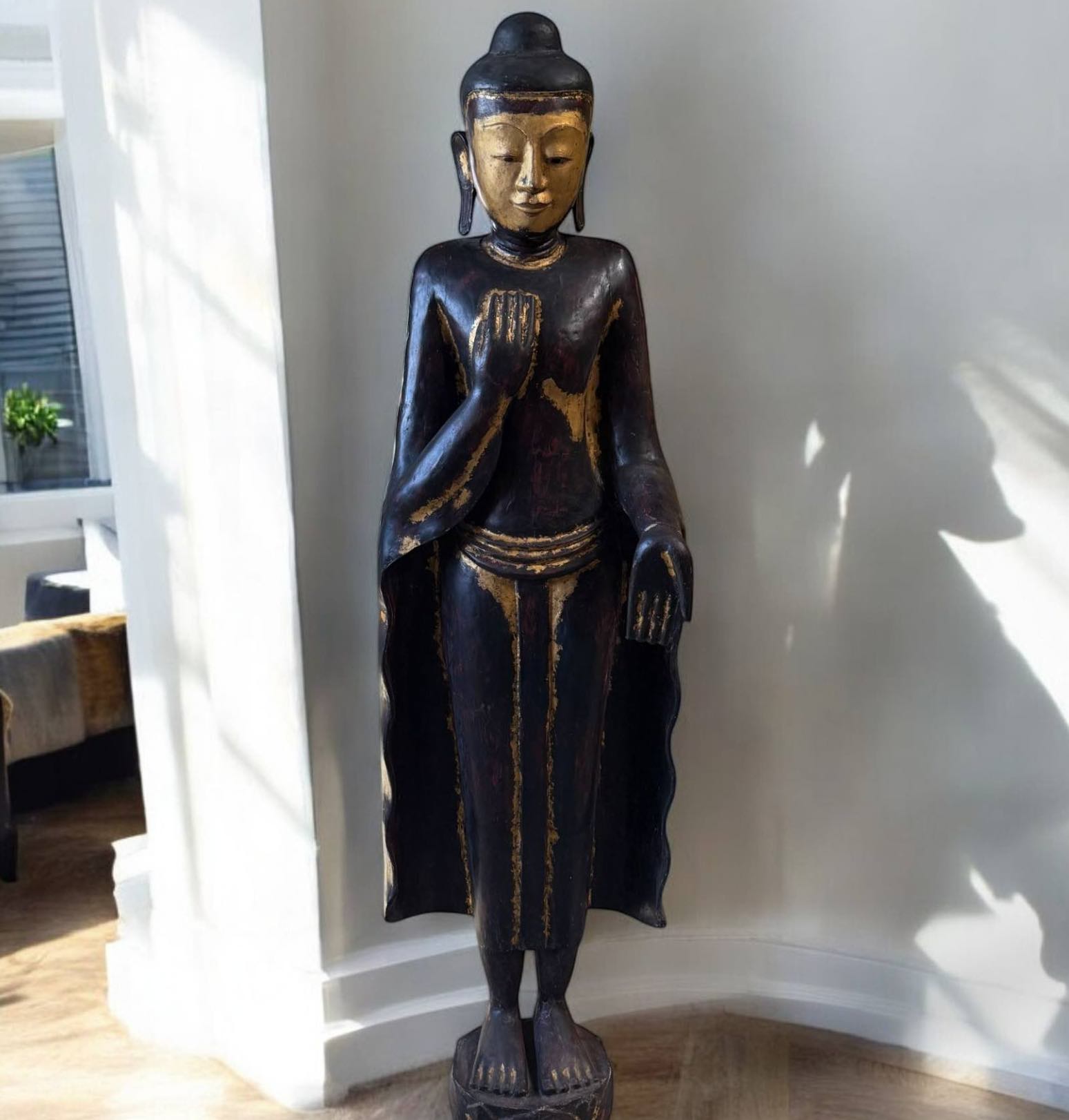 Stehender Buddha mit Blattgold – Symbol für Schutz & Erleuchtung Diese majestätische Buddha Statue aus Thailand zeigt den Erwachten in der Abhaya Mudra – der Geste des Schutzes und der Furchtlosigkeit. Sie steht für inneren Frieden, Vertrauen und spirituelle Stärke. Die Figur wurde aus massivem Holz gefertigt und kunstvoll mit echtem Blattgold überzogen – eine traditionelle thailändische Technik, die als Ausdruck höchster Verehrung gilt. In Thailand bringen Gläubige feine Goldblättchen auf Buddhafiguren auf, um Dankbarkeit zu zeigen und spirituelle Verdienste zu sammeln. Gold steht für Reinheit, Erleuchtung und die unvergängliche Wahrheit des Dharma. Mit einer Höhe von 140 cm und einem Gewicht von rund 17,5 kg beeindruckt diese Statue durch ihre kraftvolle Präsenz. Sie stammt aus einer deutschen Sammlungsauflösung und wird auf ein Alter von etwa 50 Jahren geschätzt. Jedes Detail – von der fein gearbeiteten Robe bis zur sanften Gesichtsausstrahlung – strahlt Ruhe, Würde und Spiritualität aus. Ideal für Meditationsräume, Eingangsbereiche oder als edles Sammlerstück. • Ursprung: Thailand – aus deutscher Sammlungsauflösung • Material: Holz, mit Blattgold überzogen • Maße: ca. 140 × 33 × 25 cm • Gewicht: ca. 17,5 kg • Alter: ca. 50 Jahre • Darstellung: Stehender Buddha in Abhaya Mudra • Symbolik: Schutz, Frieden, Erleuchtung Ein handgefertigtes Meisterstück thailändischer Kunst – Ausdruck von Spiritualität, Harmonie und zeitloser Schönheit.