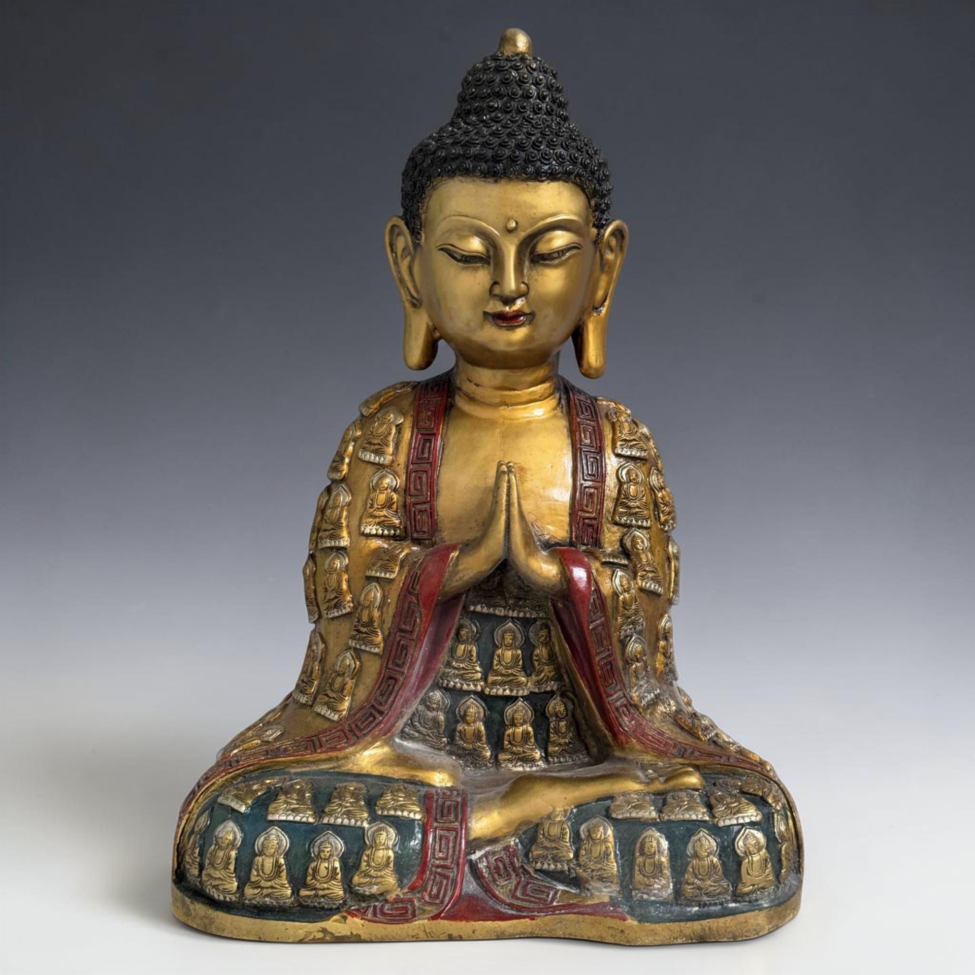 Meisterwerk thailändischer Sakralkunst: Buddha im Sukhothai-Stil Erleben Sie die zeitlose Eleganz des thailändischen „Goldenen Zeitalters“. Diese beeindruckende Bronze-Skulptur verkörpert den Sukhothai-Stil, der für seine fließenden Linien und überirdische Gelassenheit weltberühmt ist. Mit einer Höhe von 59 cm und einem massiven Gewicht von 18,5 kg ist dieses Stück eine imposante Erscheinung für anspruchsvolle Sammlungen oder als zentraler Ruhepol in großzügigen Räumlichkeiten. Die Figur zeigt Buddha in der kraftvollen Bhumisparsha Mudra (Geste der Erdkontaktnahme). Besonders hervorzuheben ist die feine Ausarbeitung der Flammen-Aura (Ushnisha) und die charakteristische Patina: Reste einer edlen Vergoldung auf dunklem Fond verleihen der Skulptur eine tiefe, historische Aura. Es handelt sich um ein sorgsam gehütetes Einzelstück, bei dem gilt: You get what you see. Stilrichtung: Sukhothai (Thailand) Darstellung: Buddha in Bhumisparsha Mudra (Sieg über Mara) Material: Bronze, teils vergoldet mit schöner Patina Datierung: Wohl Mitte 20. Jahrhundert Herkunft: Aus einer gepflegten Privatsammlung Maße (H x B x T): ca. 59 x 40 x 20 cm Gewicht: ca. 18,5 kg Zustand: Authentischer Erhaltungszustand mit charakterstarken Altersspuren Differenzbesteuert nach § 25a UStG.
